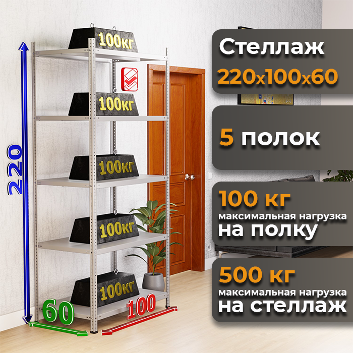 Стеллаж металлический до 100 кг на полку 220х100х60 5 полок