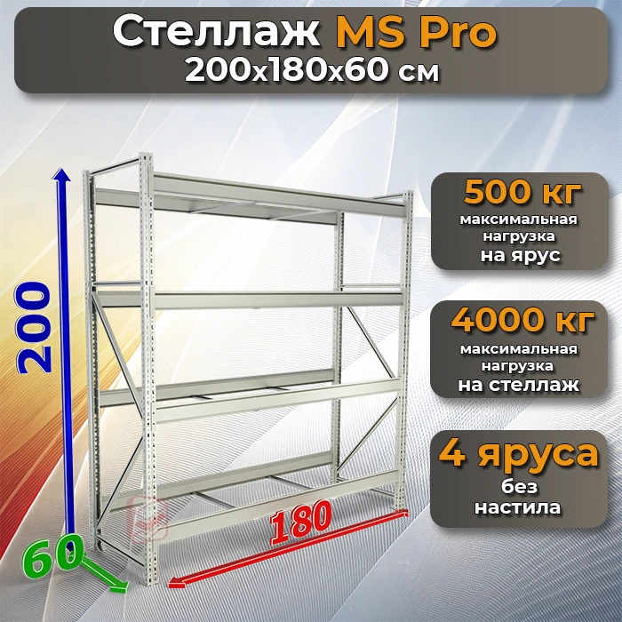 Стеллаж среднегрузовой с четырьмя полками MS Pro 200х180х60 без настила — универсальное решение для хранения грузов на складе, в гараже, кладовой или торговой точке.